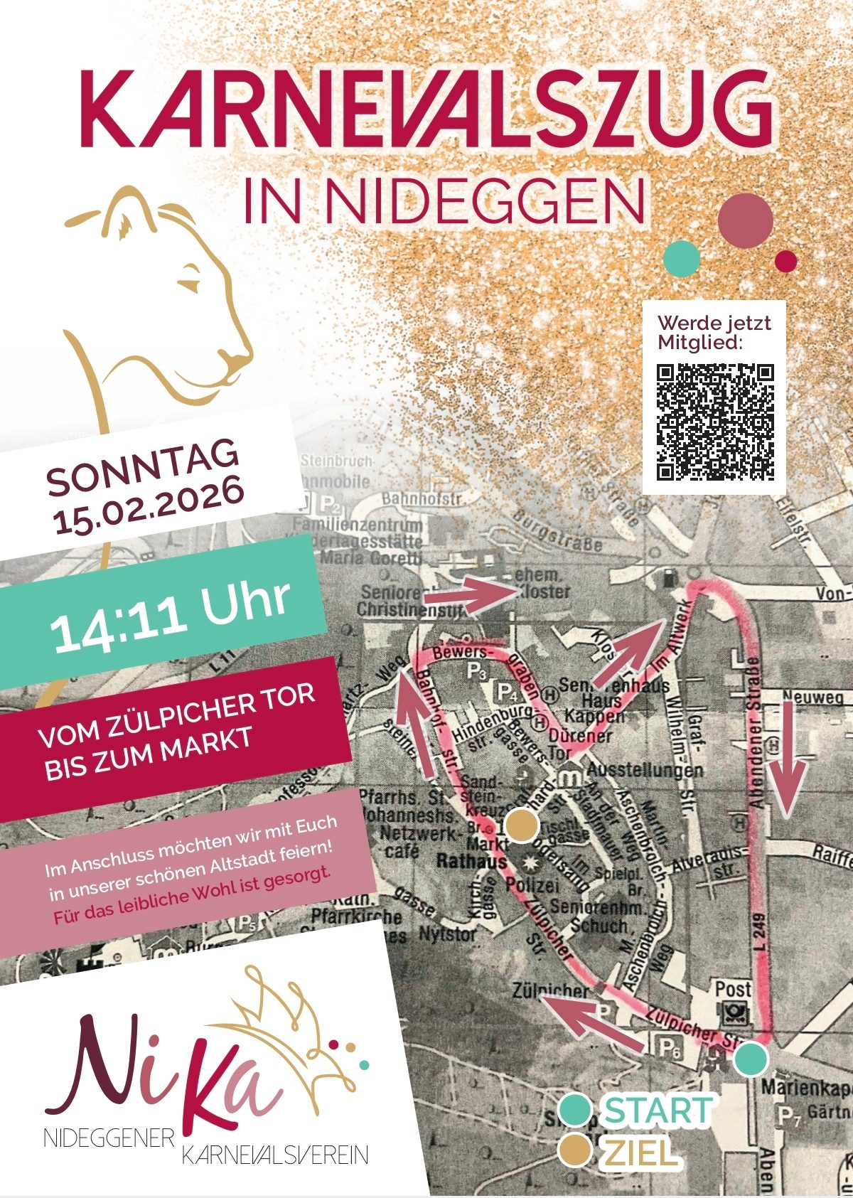 laden wir Euch auch im neuen Jahr 2025 sehr herzlich ein, unseren Karnevalszug in Nideggen mit Euren Festwagen, Fußgruppen oder als Zuschauer:innen zu bereichern! Der Zug startet am 02.03.2025.