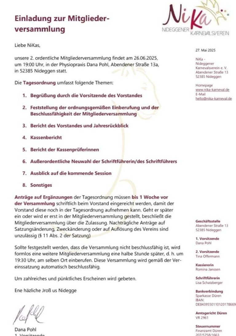 Wir laden herzlich zur Mitgliederversammlung des Karnevalsvereins ein, die am 26. Juni 2025 um 19 Uhr in der Physiopraxis Dana Pohl stattfinden wird. Kommt vorbei, bringt eure Ideen mit und lasst uns gemeinsam die zukünftigen Veranstaltungen planen. Wir freuen uns auf zahlreiche Teilnehmer und eine lebhafte Diskussion!